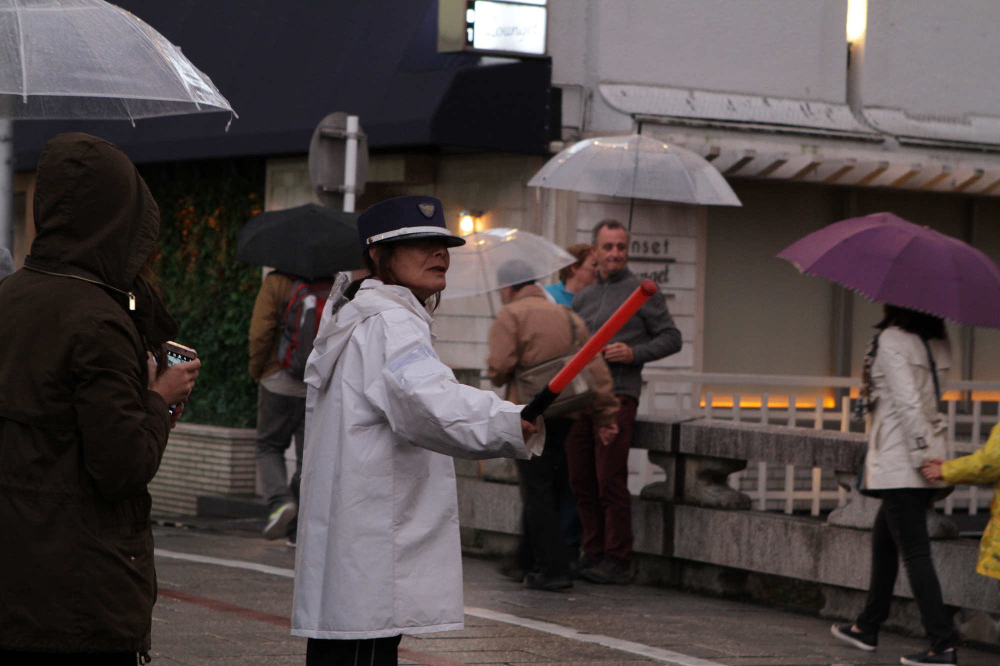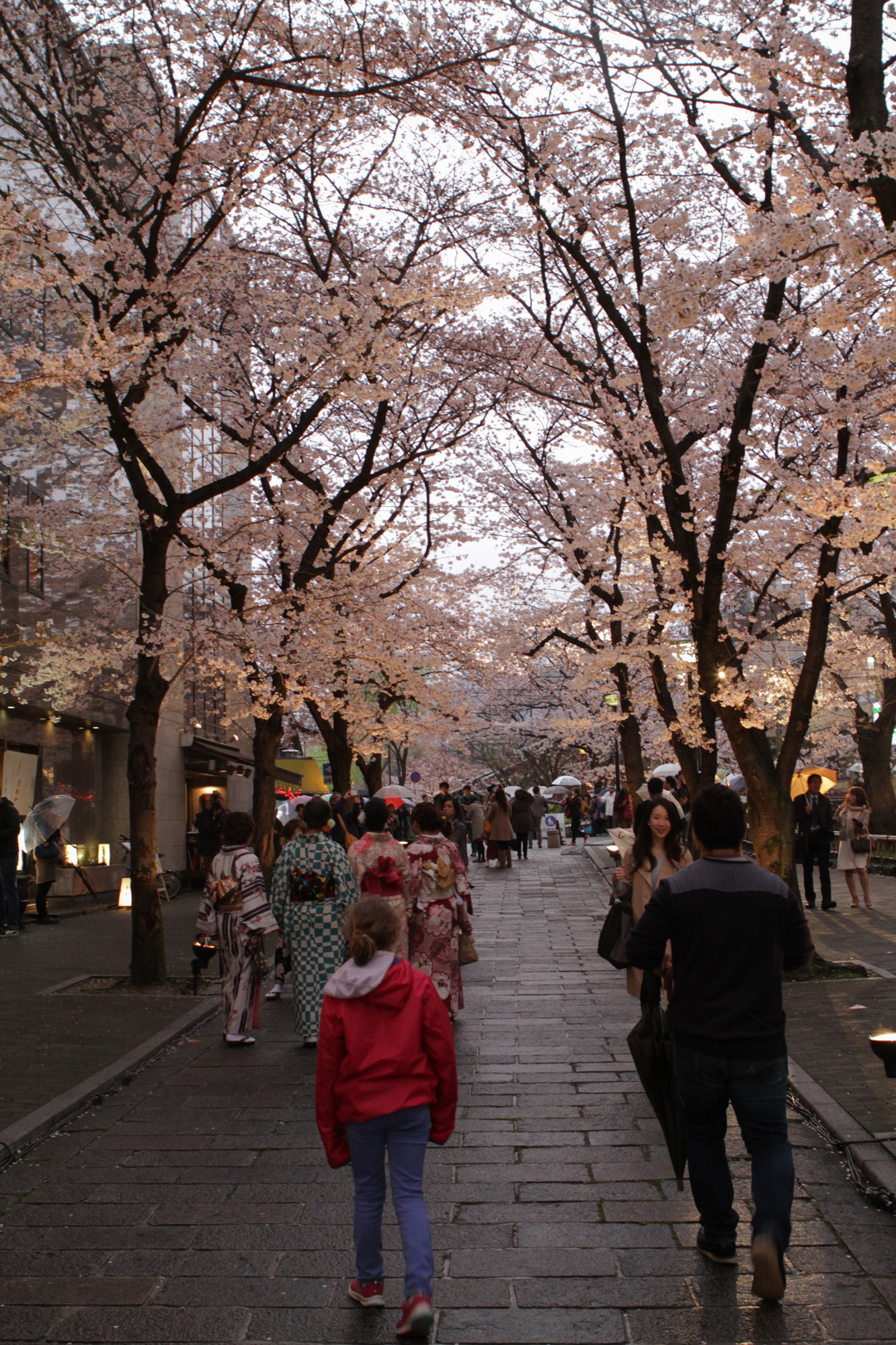 Nous croisons beaucoup de personnes en kimono ; il est à la mode d’en porter pour se promener – il est possible d’en louer à la journée –, mais nous croisons en revanche bien moins de maiko et geiko parées pour leur représentation.