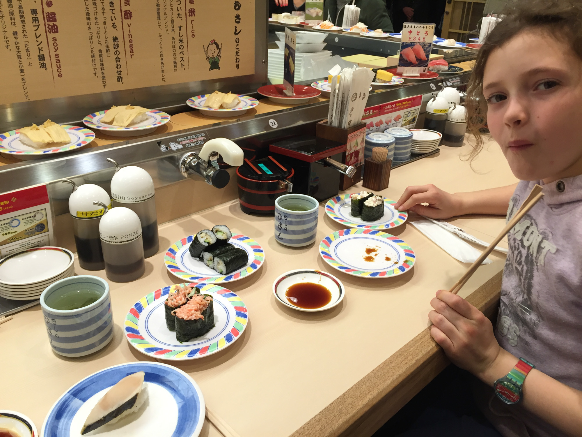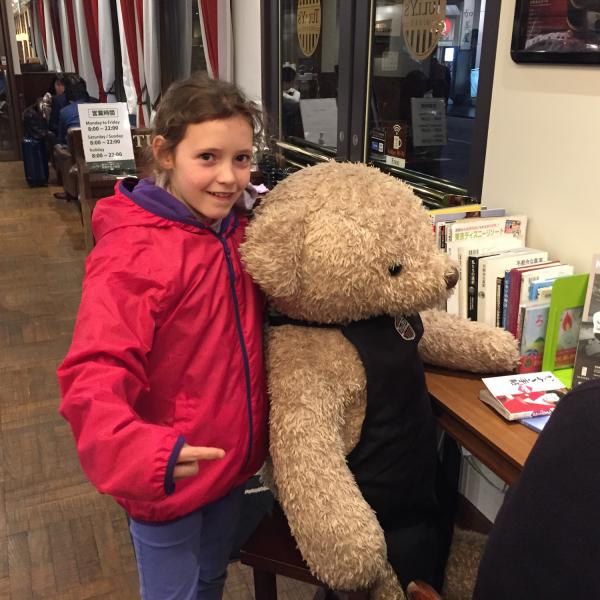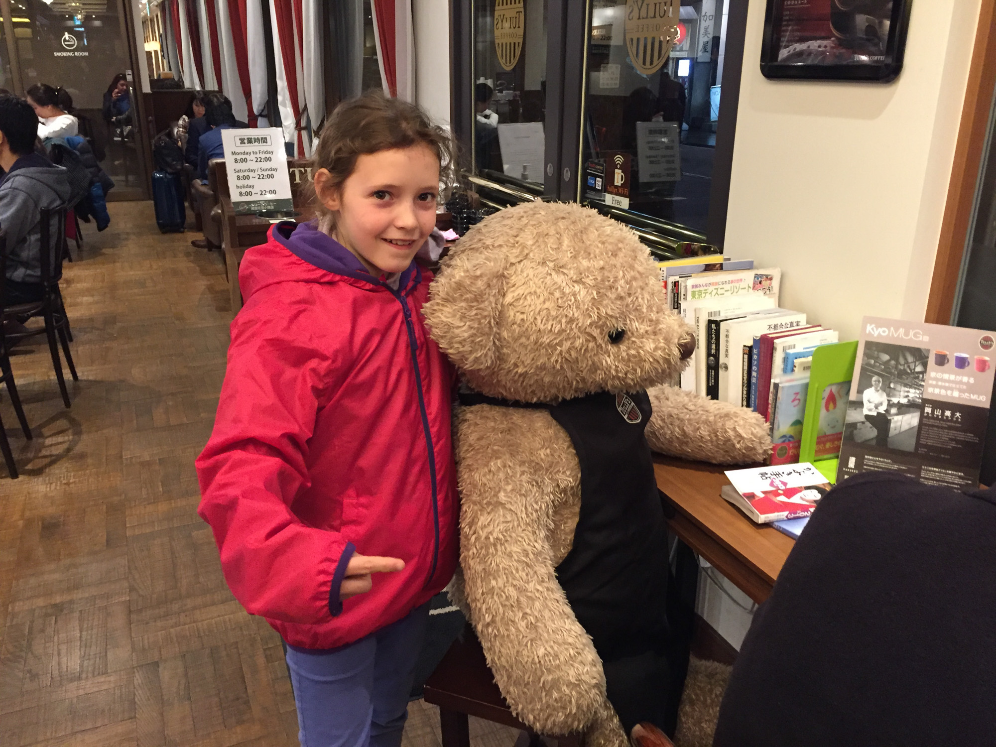 On a vu plein de sakura, de temples, de lanternes, et de dames en kimono. On est allés dans un café, j’ai pris un jus de mangue et on a fait des photos avec un nounours sur une chaise. Quand Aya nous a quittés, on a été manger des sushis dans un kaitenzushi.