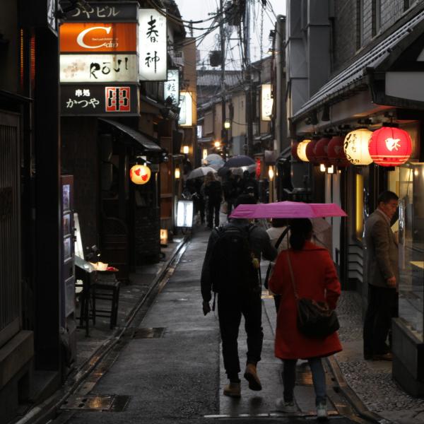 Kyoto propose une ambiance très différente, loin des gratte-ciels et de la profusion de métros. Rien ne dépasse dix étages, sinon la tour de Kyoto face à la gare ; tout est fait pour conserver le trait bien particulier de cette ville. Même McDonald a du se mettre au diapason, en abandonnant le rouge vif de son enseigne pour une teinte plus discrète.