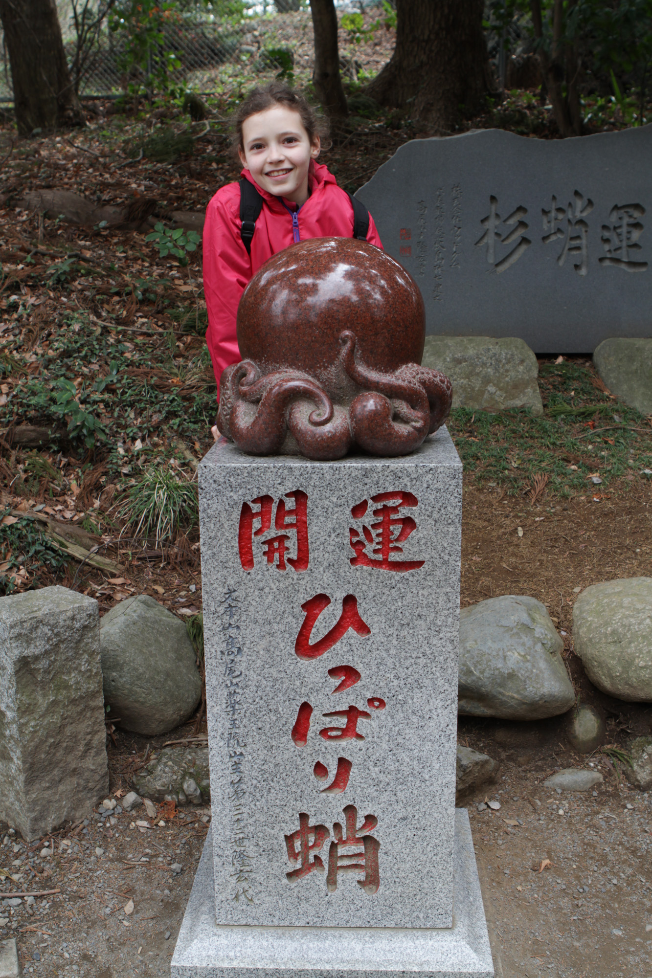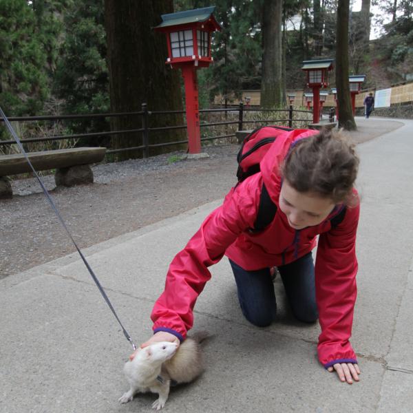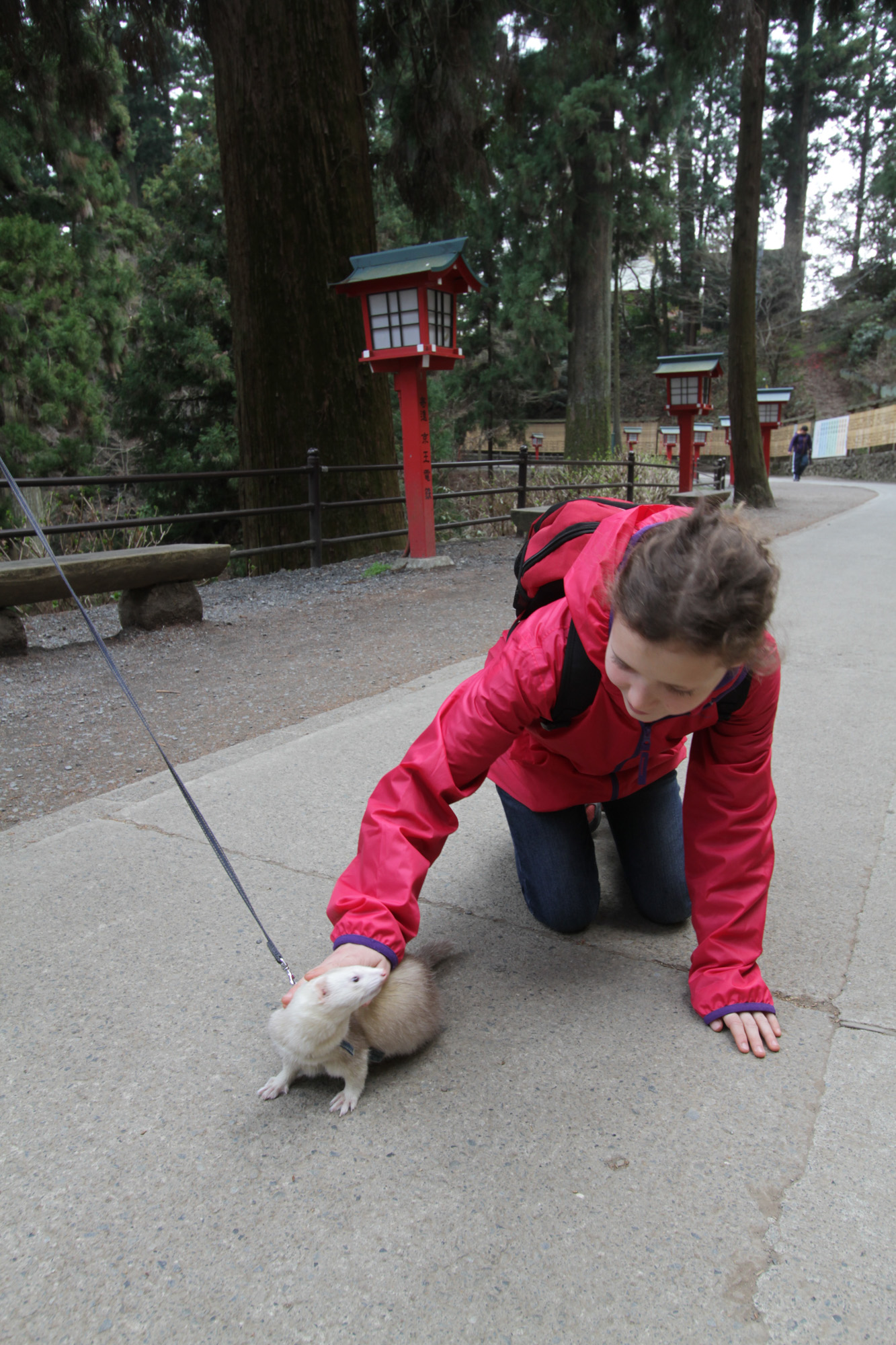 Arrivés à l’esplanade qui coiffe la montagne, l’air épais nous a privés de la vue sur le Fujisan et de l’ouest de Tokyo. Les sakura plus tardifs n’étaient pas éclos. Les écureuils volants nocturnes n’étaient pas de sortie. En revanche, un couple promenant un furet nous a offert le spectacle, et a rythmé la descente de Jade vers le funiculaire.